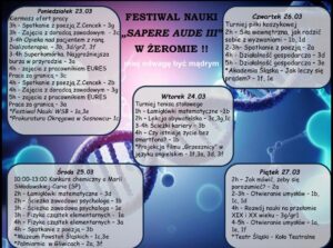 Już wkrótce startuje III Festiwal Nauki pod hasłem: "Sapere aude – miej odwagę być mądrym". Czekają Nas mega ciekawe wykłady, warsztaty, gdzie sami coś stworzycie,.