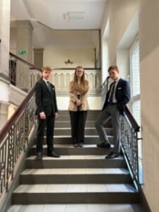Nasza wspaniała Drużyna Mówców w składzie: Paulina Kubiczek z klasy 3g, Maja Kucharska z klasy 3g, Kacper Olesiński z klasy 3g, Nataniel Rak z klasy.