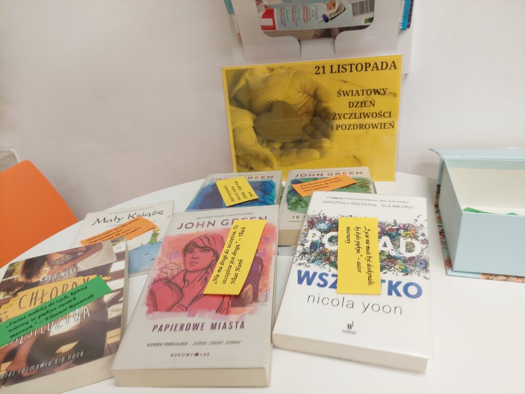 Z okazji Dnia Życzliwości w bibliotece szkolnej trwa w tym tygodniu od 17 do 21 listopada akcja „Cytat, który poprawia nastrój”, podczas której uczniowie mogą wypożyczyć książki oraz wybrać cytat dodający otuchy, motywacji i pozytywnej energii.