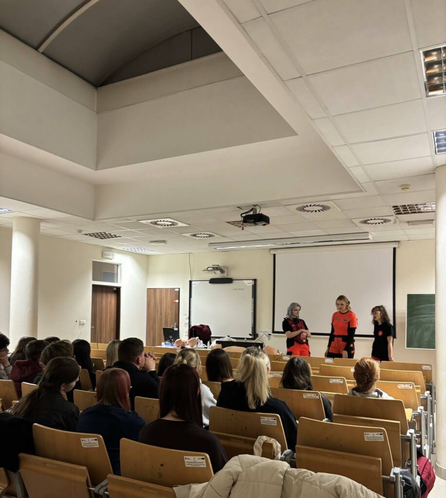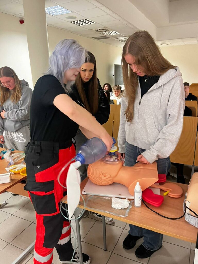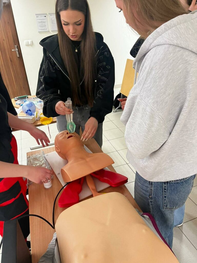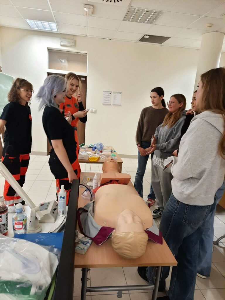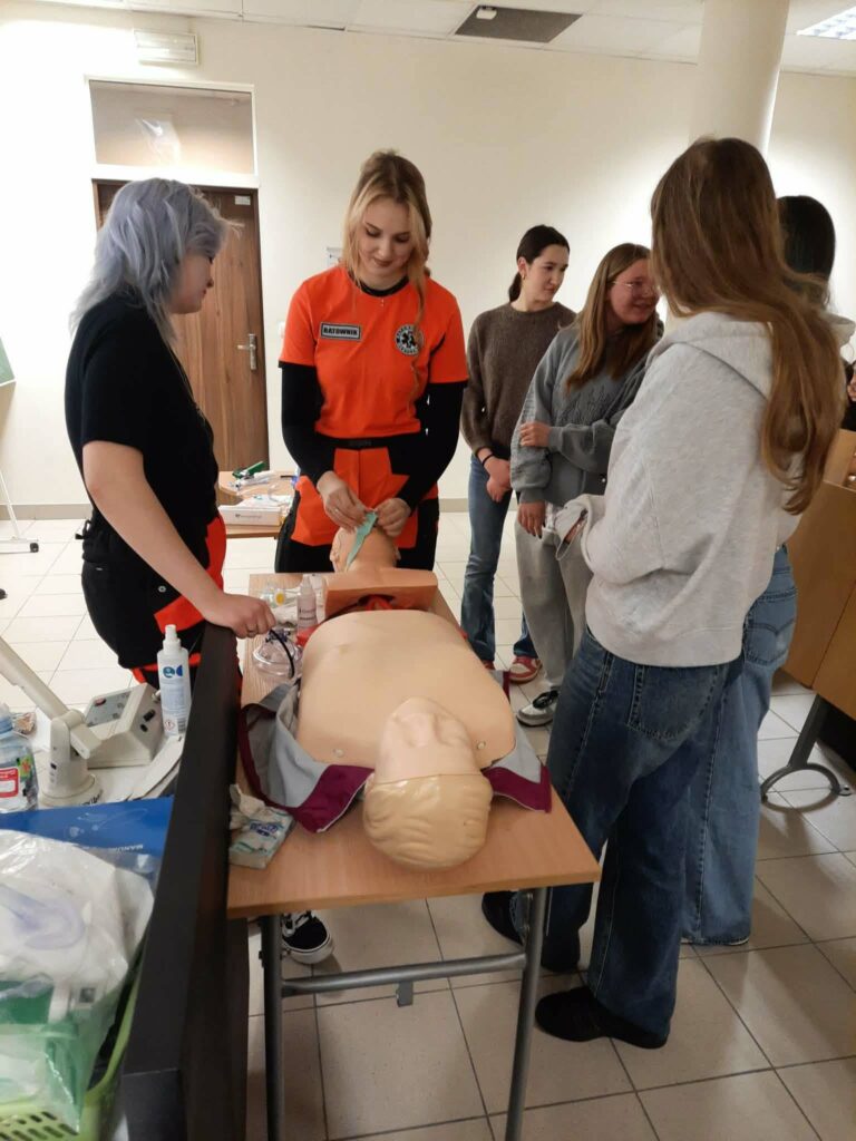 Dzień Otwarty Akademii Śląskiej w Katowicach – naszej partnerskiej szkoły wyższej był dla uczniów klas 1e i 1f -(realizujących rozszerzenie z biologii) doskonałą okazją do praktycznego przećwiczenia zasad udzielania pierwszej pomocy w sytuacjach zagrożenia oddechowego, a także do nauki udzielania pomocy z wykorzystaniem AED pod okiem Pani Barbary Podhalicz i dr n. o zdr. Michała Kucapa .
