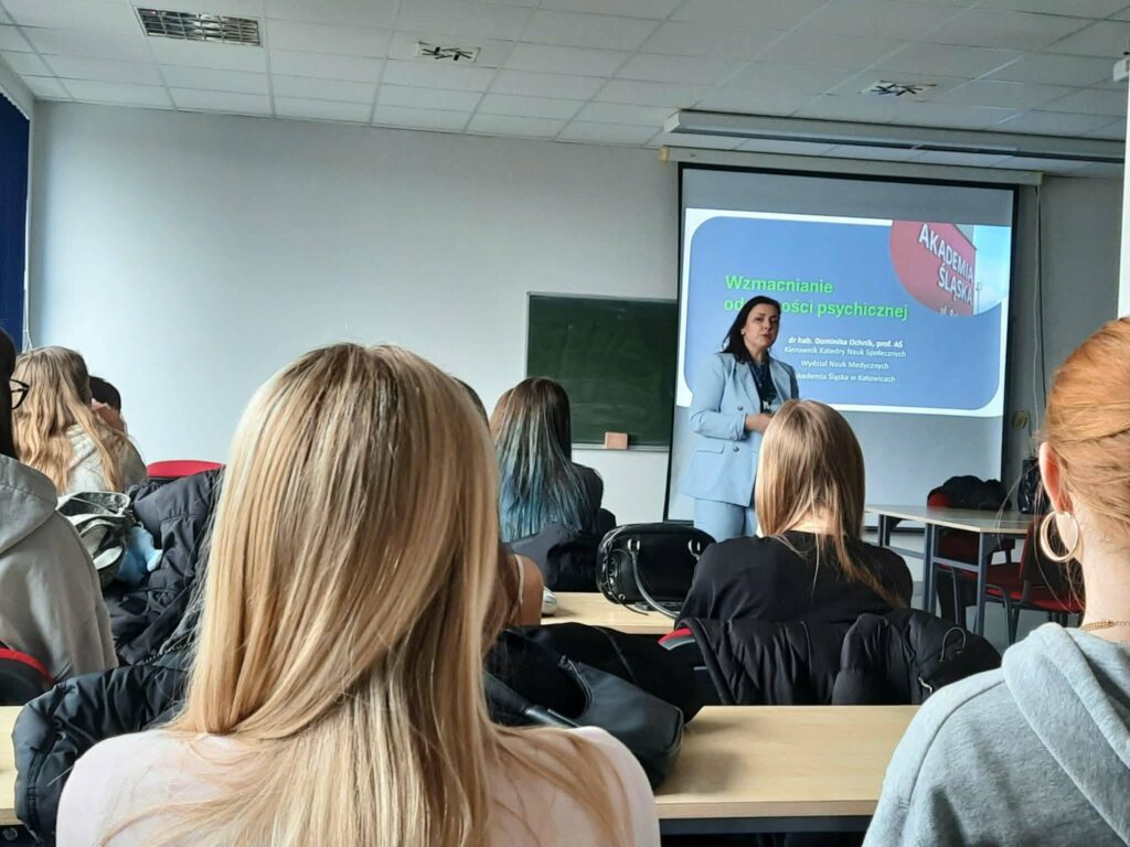 Uczniowie mieli również możliwość wysłuchania inspirującego wykładu pt. „Wzmacnianie odporności psychicznej”, który poprowadziła dr hab. Dominika Ochnik, prof. AŚ.