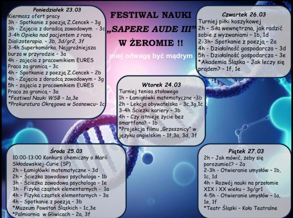Już wkrótce startuje III Festiwal Nauki pod hasłem: „Sapere aude – miej odwagę być mądrym”. Czekają Nas mega ciekawe wykłady, warsztaty, gdzie sami coś stworzycie, zajęcia, które rozwalą system i pokażą naukę od innej strony, goście, którzy wiedzą co i jak i podzielą się swoją wiedzą, wyjścia poza szkołę (bo kto by chciał siedzieć cały czas w ławce).