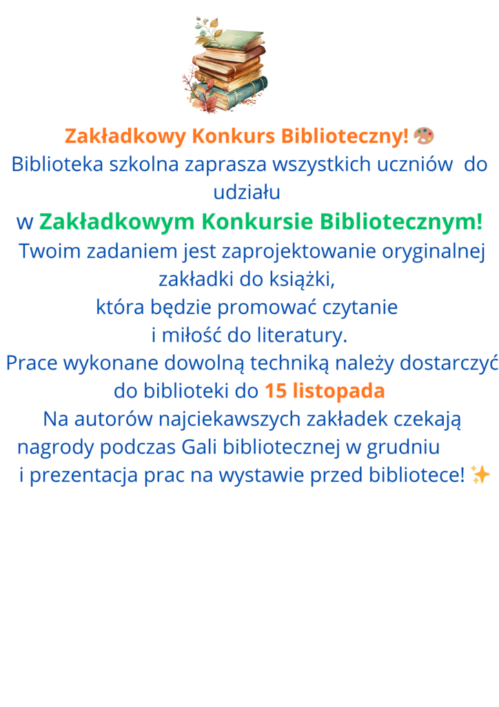 Konkurs Biblioteczny 23 października 2025 Nawigacja wpisu Poprzedni Poprzedni wpis: Książka na jesienne wieczoryNastępny Następny wpis: Akcja „Poleć książkę koledze”