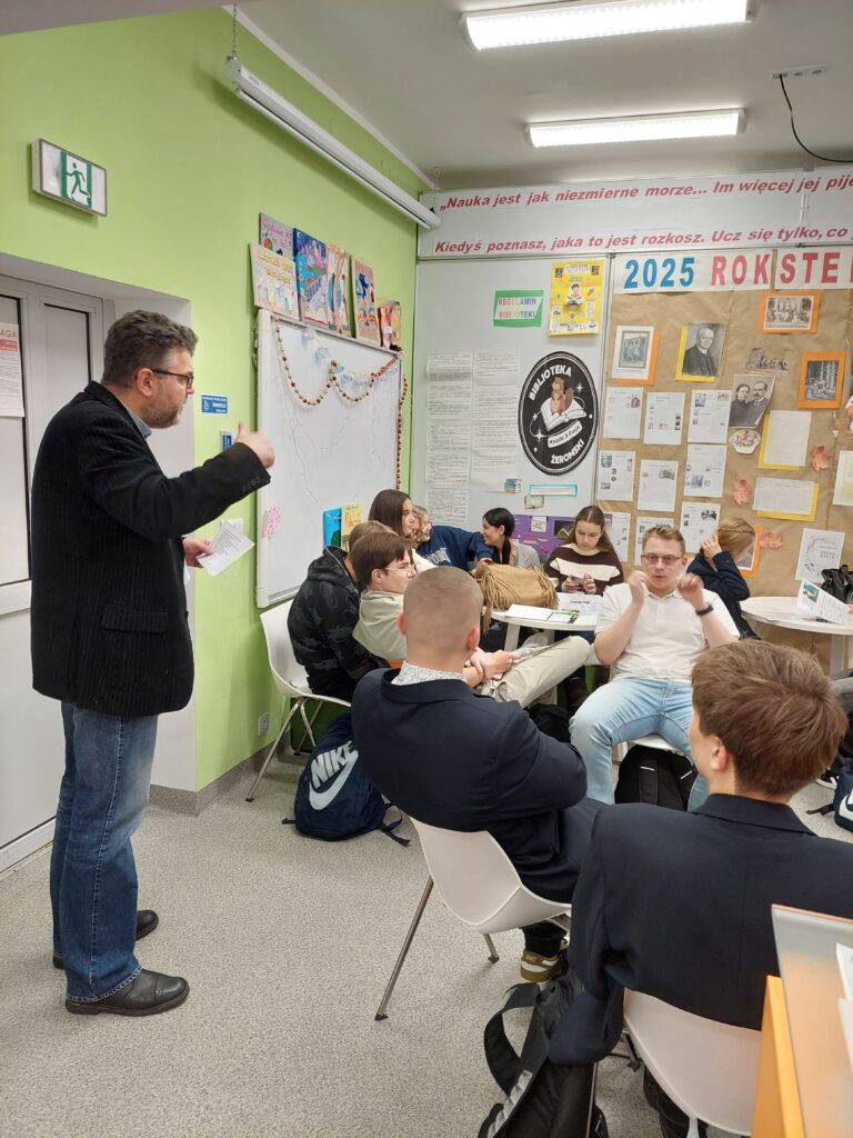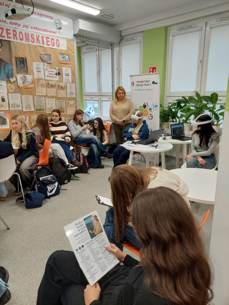 Dnia 8 grudnia w naszym liceum odbyły się wyjątkowe warsztaty prowadzone przez pracowników PUP w Dąbrowie Górniczej, podczas których uczniowie mieli okazję odkrywać różne ścieżki kariery z wykorzystaniem okularów VR. Zajęcia pozwoliły uczestnikom przenieść się do wirtualnego świata i „na własne oczy” zobaczyć, jak wygląda praca w takich zawodach jak m.in. lekarz, mechanik, architekt, pilot czy programista.