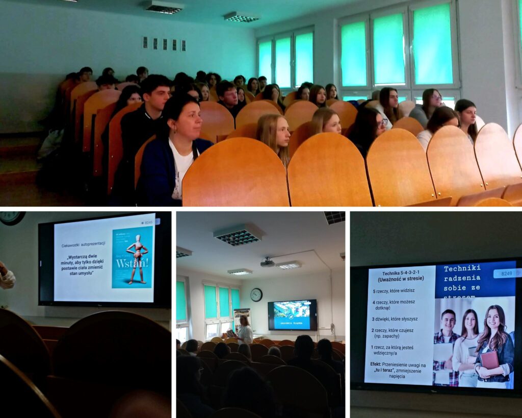 Uczniowie poznali skuteczne techniki radzenia sobie ze stresem 😌💭, uczyli się zasad dobrej autoprezentacji 🎤🌟 oraz pracowali nad odkrywaniem i wzmacnianiem swoich mocnych stron 💪🔍
