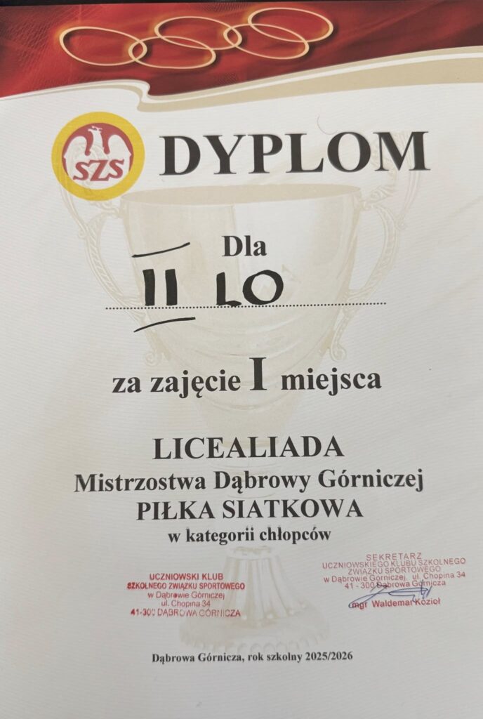 W znakomitym stylu nasi siatkarze w  składzie: Pasowicz Bartosz 1c, Adaszewski Kajetan 1D, Markowski Bartosz 1D, Pawłowski Marek 1D, Wydrzyński Dariusz 2B, Król Maciej 3A, Kupiszewski Robert 3A, Piniecki Przemysław 3A, Szuliński Dawid 3A, Wydrzyński Rafał 3B, Sikora Dawid 3E, Otok Szymon 4C, Nocoń Jakub 4E, zdobyli Mistrzostwo Dąbrowy Górniczej w siatkówce.